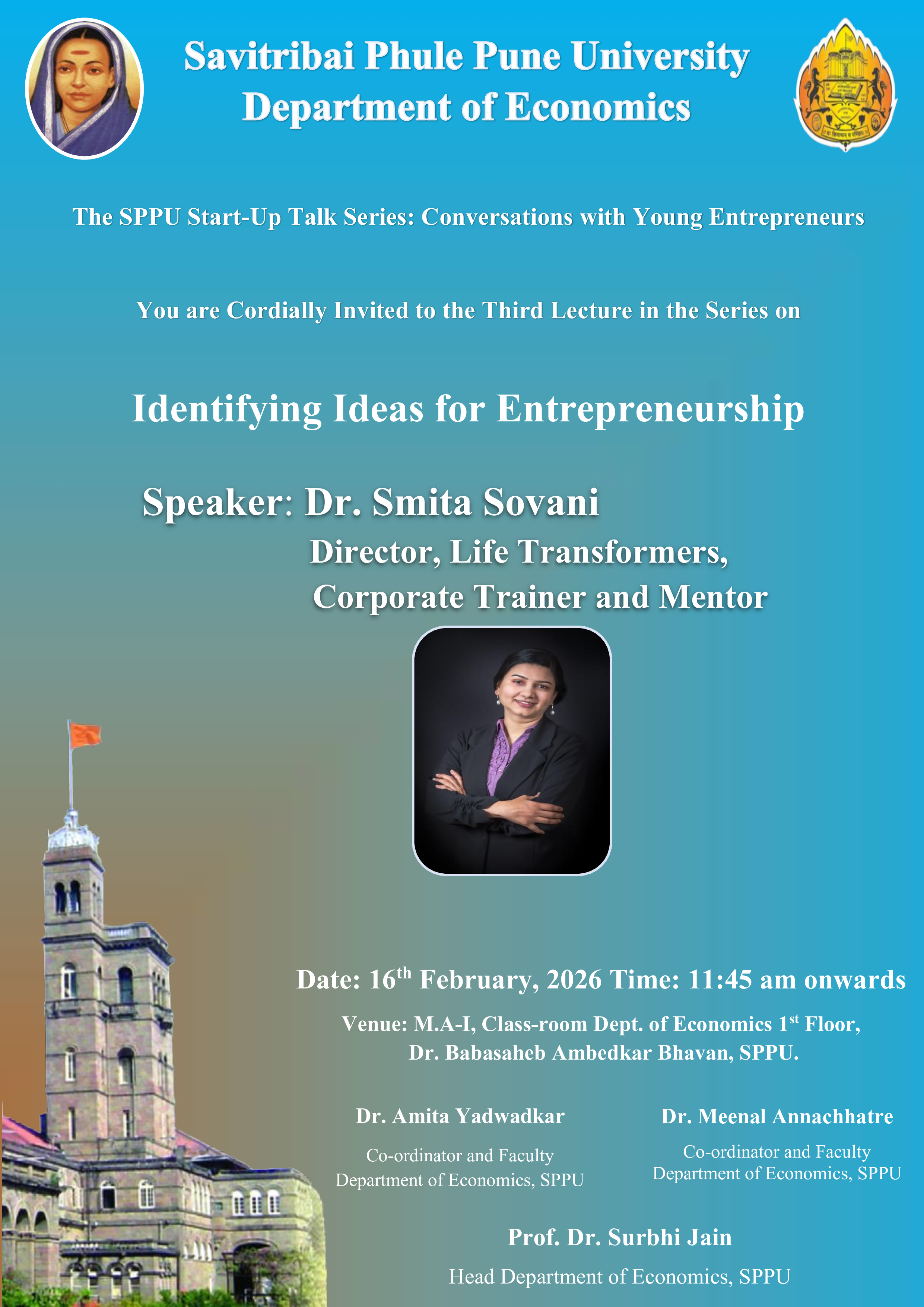 Department of Economics SPPU organizes the The Third Lecture in the SPPU Start-Up Talk Series: Identifying Ideas for Entrepreneurship, 16th February, 2026.